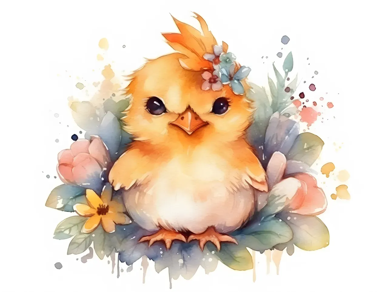 watercolor fluffy greeting garden season small design yellow farm paint ai colour nature tradition funny floral cartoon religion postcard festive springtime hand drawn beautiful colourful farmhouse clip art pretty painting easter flower bird egg chicken little chick decoration white art isolated card happy cute holiday baby animal spring newborn drawing easter egg