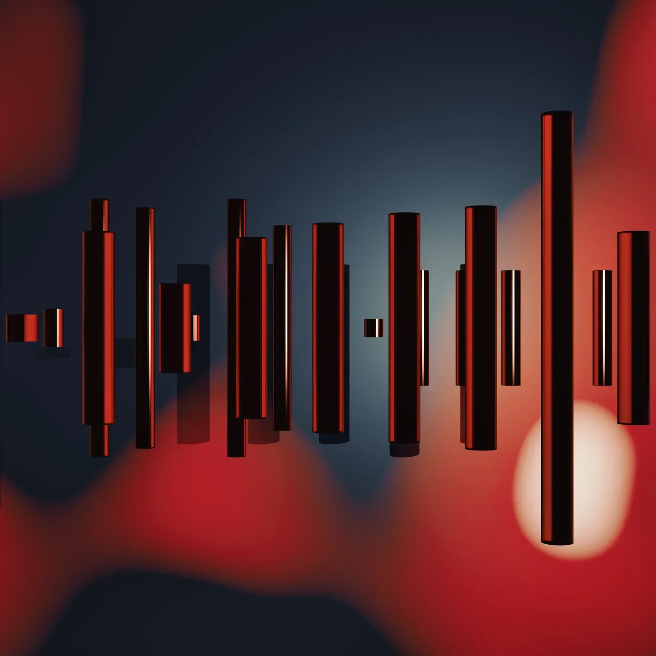 Colorful 3D abstract art with red metal cylinders on abstract background.