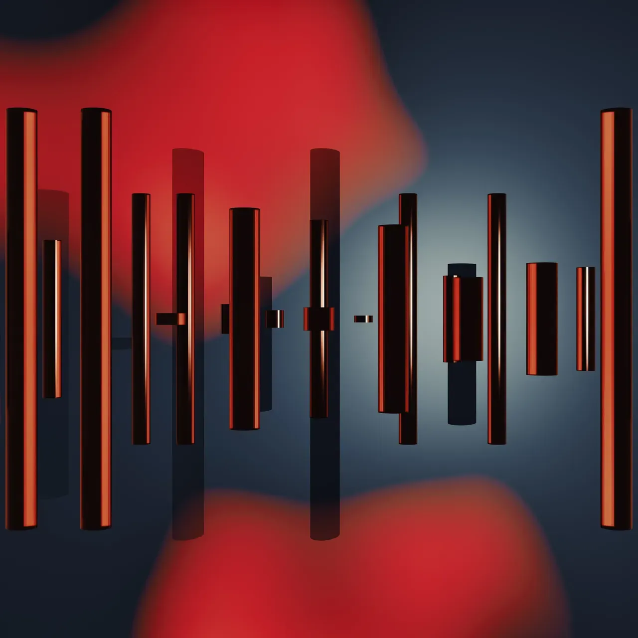 Colorful 3D abstract art with red metal cylinders on abstract background.