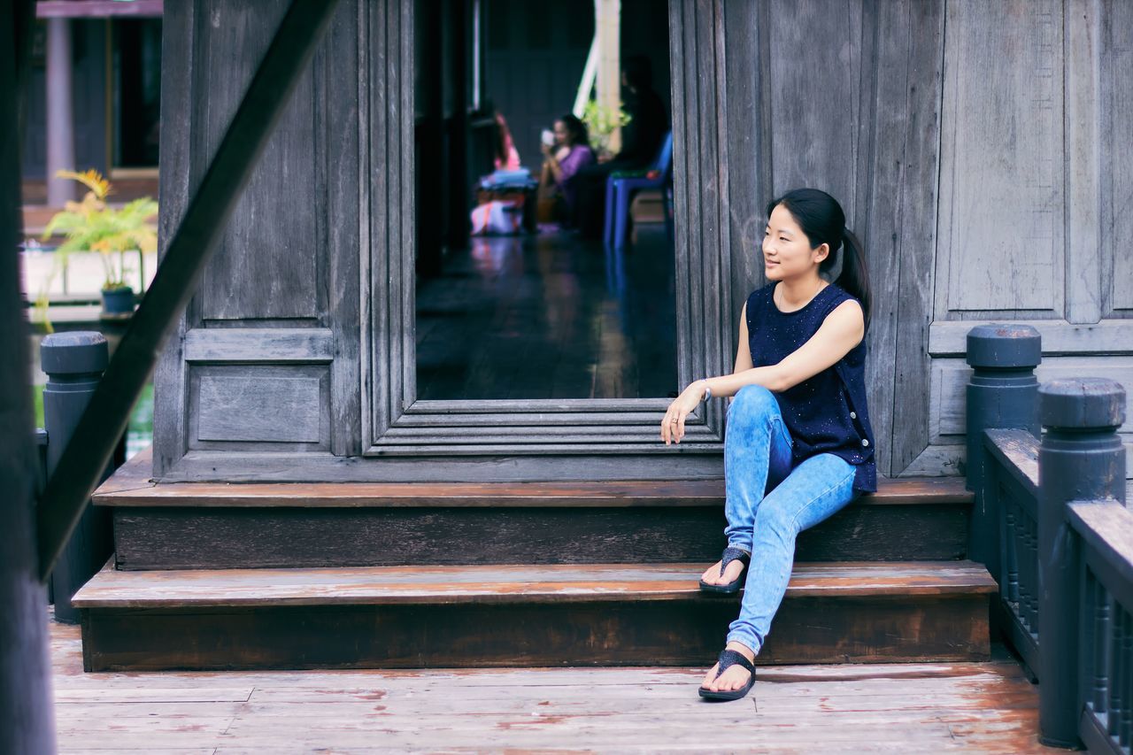 Asian Asian And Indian Ethnicities Balcony Casual Clothing Contemplation Curtain Day Day Dreaming Front View Happiness Headshot Leisure Activity Lifestyles Looking Away One Person Outdoors Real People Smiling Standing Thailand Young Adult Young Women