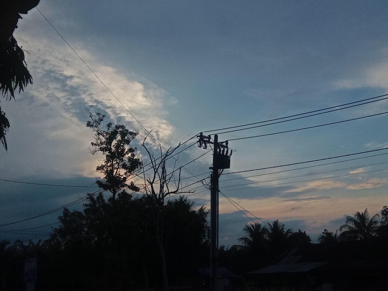 cable sky electricity tree power line technology cloud electricity pylon power supply silhouette plant evening nature dusk power generation sunset low angle view no people telephone line overhead power line sunlight outdoors beauty in nature telephone pole light scenics - nature architecture — in Padangkedondong, Indonesia