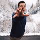 Cropped hand throwing stone on field against sky