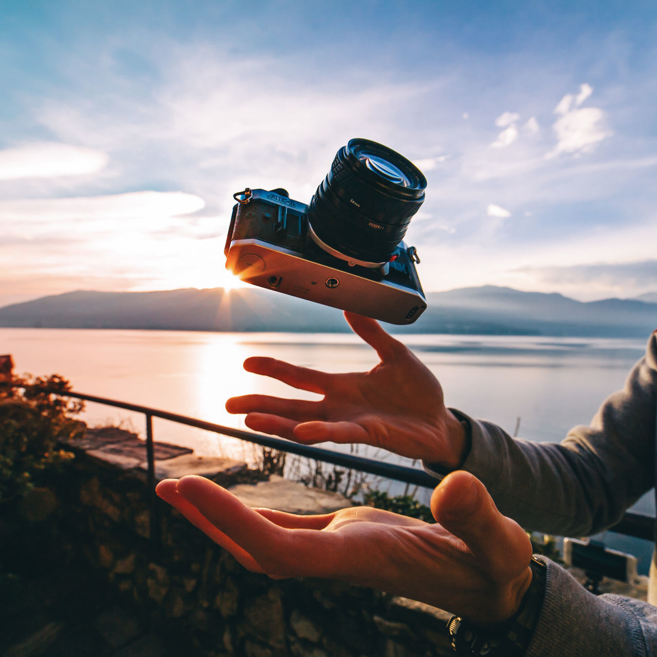 Beauty In Nature Camera - Photographic Equipment Catching Cropped Falling Human Hand Mid-Air Motion Nature One Person Outdoors Part Of Real People River Sky Sunlight Sunset Unrecognizable Person Water imbalance — at Eremo di Santa Caterina del Sasso in Leggiuno, Italy