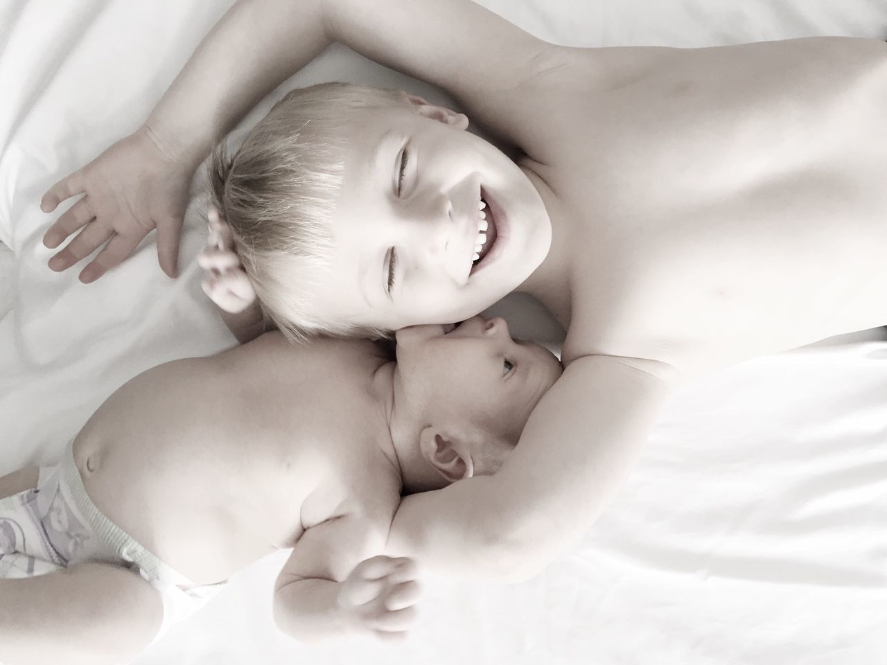 Baby Baby Boys Babyhood Bed Bonding Boys Brother Caucasian Ethnicity Childhood Cute Directly Above Elementary Age Family Front View Indoors Innocence Leisure Activity Lifestyles Looking At Camera Love Lying Down Lying On Back Portrait Real People Relaxation Resting Shirtless Sibling Smiling Toddler Togetherness Two People Waist Up — in Bel Air, United States