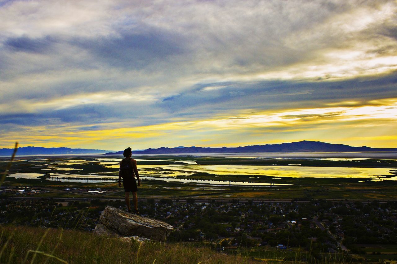 Rear view of a woman overlooking buildings