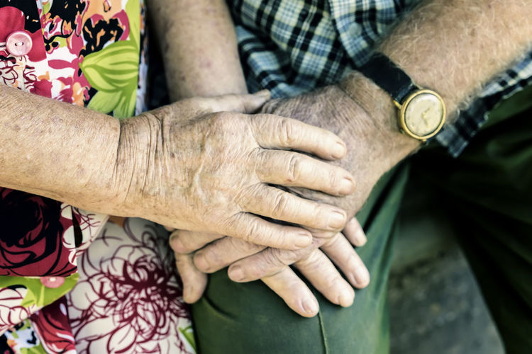 Crop of anonymous elderly couple holding hands while sitting on a park bench