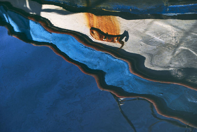 Rear view of man sitting with arms outstretched on rusty metallic pipe while looking at sea against sky