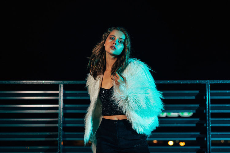 Portrait of young woman standing outdoors against at night
